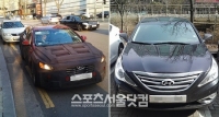 6일 <더팩트>에 찍힌 NF 쏘나타(왼쪽)는 이전 모델인 YF 쏘나타보다 라디에이터 그릴이 더 커지고 헤드라이트 부분이 확연히 달랐다./신진환 인턴기자..