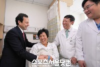▲ 22일 마이크 아카몬 한국지엠 사장이 인천의료원에서 환자의 손을 잡고 있다. [더팩트|황준성 기자] 한국지엠 임직원들이 설립한 사회복지..