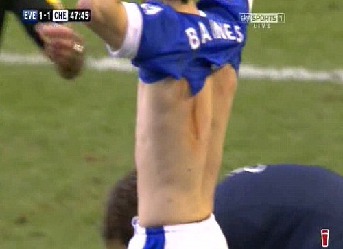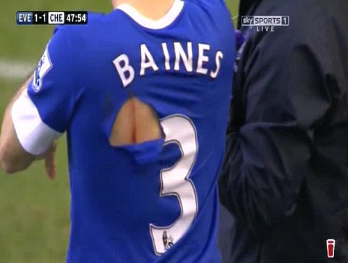 베인스는 30일(이하 한국시각) 영국 구디슨 파크에서 킥오프한 2012~2013시즌 잉글리시 프리미어리그 20라운드 첼시와 홈경기에서 1-1로 맞선 후반 2분 상대 공을 가로챈 뒤 돌파를 시도하려다 게리 케이힐 태클에 걸려 넘어졌다. 가벼운 충돌로 보였으나 베인스는 고통스러워했다. 케이힐은 주저앉아 베인스를 바라보더니 미안해했다. 베인스는 두 손으로 등을 부여잡았다. 의료진이 달려왔다. 등번호가 적힌 상의는 찢어졌고 등 왼쪽에 굵은 상처가 났다. 케이힐의 축구화 스터드가 베인스의 유니폼을 관통한 것이다.