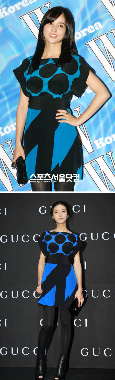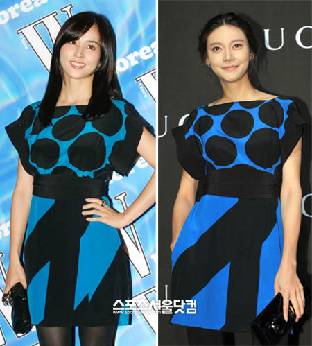 한혜진과 차예련의 경우도 그랬다. 두 스타는 블루와 블랙이 조화를 이룬 똑같은 프린트 드레스를 입었다. 그러나 이미지가 전혀 달랐기에 두 스타가 내뿜는 분위기도 180도 달랐다. 한혜진은 지난 10월에 열렸던 '제 4회 Love Your W 유방암 기금 마련 이벤트'에서, 차예련은 지난 8월에 있었던 '구찌(GUCCI) 2009 가을/겨울 컬렉션'에서 입었다.