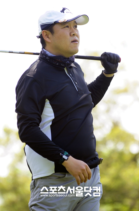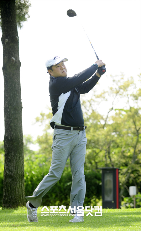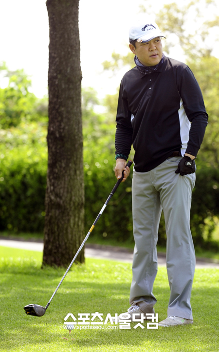 자선 골프대회에 참가한 방송인 김구라가 묵묵히 티샷을 준비하고 있다.