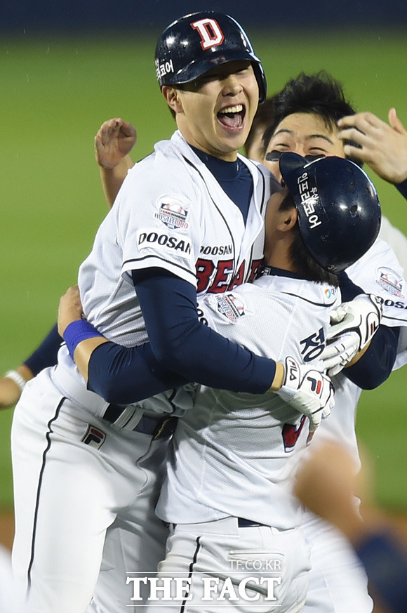 두산의 박건우가 연장 10회말에 끝내기 안타를 치며 준플레이오프 1차전을 따냈다.
