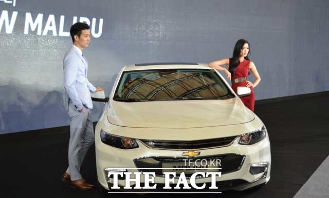 | 27일 오전 11시 한국지엠의 신형 말리부 발표회에서 슈퍼모델 권은진이 포즈를 취하고 있다. /고척스카이돔=장병문 기자 |