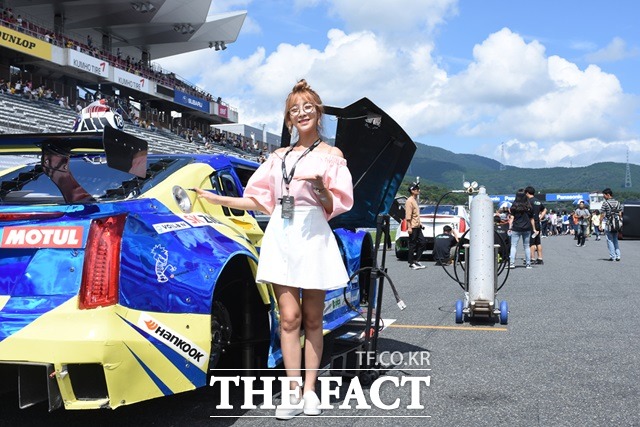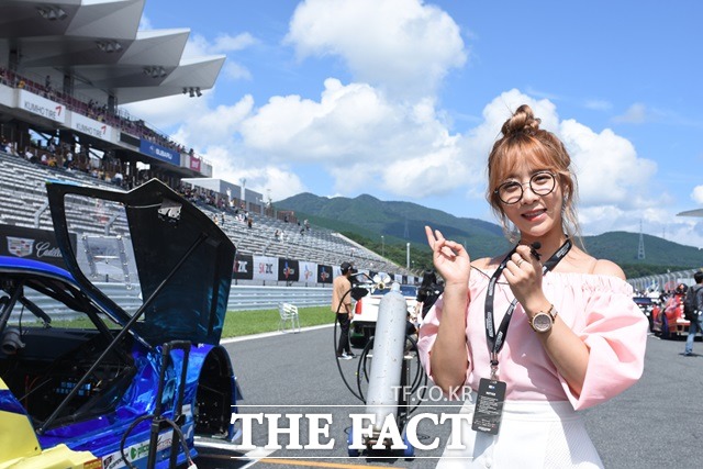 전날 우천으로 치러진 예선과 달리 화창한 날씨속에 펼쳐진 스톡카 레이스 결승전에 앞서 개그우먼 안소미가 한국 선수들을 응원하고 있다.