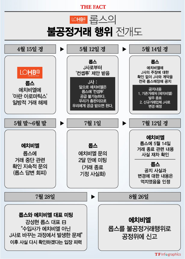 에치비엘은 롯데쇼핑 롭스에 바디상품을 납품하는 중소업체인데 롯데측이 사전에 아무런 고지도 없이 일방적으로 거래를 중단하고 계약서 내용을 무시하는 등의 횡포를 일삼아 결국 마지막으로 공정위 문을 두드렸다.