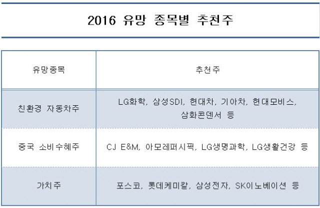 대우증권 김상호 연구원도 지난해에 이어 가치주 강세 지속을 예상했다. 김 연구원은 “2014년에 이어 지난해 상반기까지 시장의 주도주는 성장주였지만, 지난해 하반기부터 가치주 포트폴리오가 강세를 나타내며 2015년의 승자는 성장주가 아닌 가치주였다”면서 “2016년엔 미국의 기준금리 인상으로 미국 장기금리 상승과 함께 한국 장기금리도 1분기를 바닥으로 상승할 가능성이 높아 가치주에 유리한 환경”이라고 진단했다.