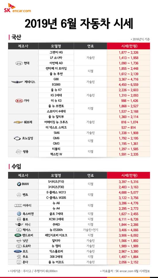 7일 SK엔카 직영 중고차 몰 SK엔카닷컴에 따르면 6월은 휴가철을 앞두고 차량 수요가 꾸준히 이어져 중고차 가격이 평균적으로 보합세를 보이지만 이달은 국산차와 수입차 모두 소폭 하락했다. 국산 중고차와 수입차 시세는 전월 대비 각각 평균 2.0%, 2.6% 낮아졌다.