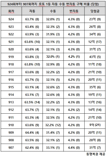 동행복권에 따르면 자동과 수동, 반자동의 로또복권 구매 비율은 매 회차 비슷하다. 로또복권 구매 비율 영향 때문인지 몰라도 반자동 1등 당첨자는 보기 어렵다. 구매 비율이 자동이나 수동에 비교가 되지 않을 만큼 극도로 낮아 반자동의 로또복권 당첨 확률은 사실상 기적에 가깝다고 로또복권 판매점 관계자들은 말한다. 참고로 전 회차인 924회 로또복권 구매 비율은 자동 63.7%, 수동 32.0%, 반자동 4.3%이다.
