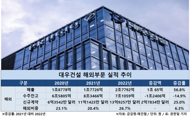 대우건설의 해외 사업 매출이 상승세로 돌아선 것은 5년만이다. 이 회사 해외 실적은 2016년 전사 매출의 30.8%인 3조3407억 원을 달성한 뒤 줄곧 내림세를 보였다. 특히 2021년에는 해외 매출이 1조7726억 원으로 쪼그라들기도 했다.