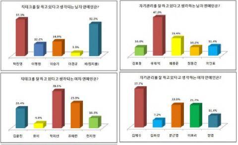 ‘자기관리를 잘 하고 있다고 생각하는 남자 연예인’은 개그맨 유재석이 47.0%(693명)로 1위를 기록했다. 영화배우 배용준은 21.4%(316명), 영화배우 차인표 11.4%(168명) 이었다. 이 밖에 영화배우 장동건과 개그맨 강호동은 각각 10.2%(151명)와 10.0%(148명)를 차지했다.