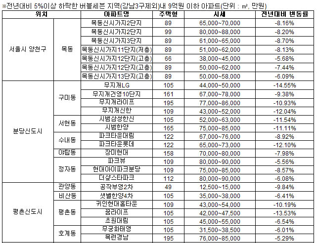 시범삼성한신 105㎡는 같은 기간 11.5%가 떨어져 5억2000만~6억3000만원에 매물이 나오고 있다. 이 아파트는 33개 동 1781가구로 1991년 9월에 입주했다. 분당선 서현역이 걸어서 5분 거리에 위치한다. 편의시설로는 삼성플라자, 롯데백화점, 분당서울대병원 등이 있고, 중앙공원이 인접해 있다. 교육시설로는 서현초, 서현중, 양영중, 서현고 등이 있다. 기타 분당신도시 구미동의 무지개LG 105㎡는 전년도 대비 무려 14.5%가 떨어져 현재 4억4천만~5억원이고, 수내동의 파크타운롯데 122㎡는 12.1%가 떨어져 6억5000만~7억3000만원이다.