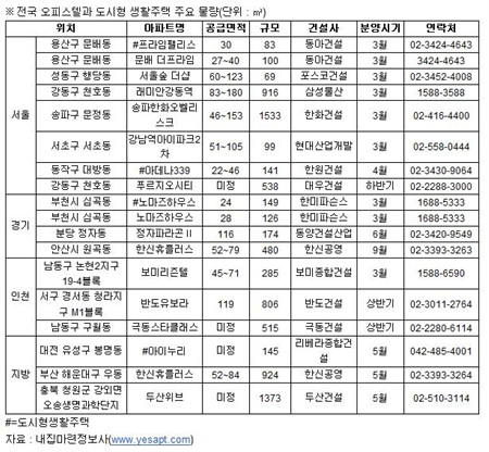 인천에서는 보미종합건설이 인천 논현2지구에 285실의 오피스텔을 이번 달 중에 분양할 계획이다. 그리고 반도건설은 청라지구M1블록에 806실, 극동건설은 남동구 구월동에 515실 등이 분양될 계획이다. 지방에서는 리베라종합건설이 대전 유성구 봉명동에 ‘아이누리’ 도시형 생활주택 145가구를 5월에 공급할 예정이다. 대전지하철 1호선 유성온천역이 걸어서 5분 거리에 있다.