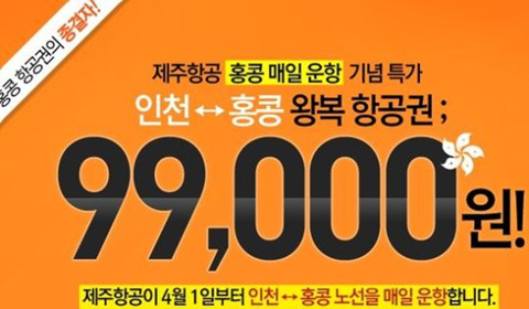 제주항공 관계자는 "성공적인 홍콩 취항실적을 바탕으로 오는 4월1일부터 증편을 결정했다"며 "이번 특가는 기존 제주항공 항공료에서도 약 70% 할인된 가격이어서 4월 중 홍콩을 다녀올 계획이 있다면 예약을 서둘러 달라"고 당부했다.