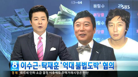 [고민경 기자] SBS가 개그맨 이수근과 탁재훈이 억대 불법 도박 혐의로 조사를 받았다고 보도했다. 10일, SBS 8시 뉴스는 개그맨 이수근과 탁재훈 등 연예인 다수가 불법 인터넷 스포츠 도박을 한 혐의로 검찰에 소환됐다고 단독 보도했다. 보도에 따르면 이들은 사설 인터넷 스포츠 도박 사이트에서 수억원대의 도박을 한 혐의로 서울중앙지검 강력부에 출석해 조사를 받았다. 이들은 휴대전화로 하는 일명 '맞대기 도박'으로 한 번에 수십만 원에서 수백만 원 씩 베팅을 해 온 것으로 드러났다. 이는 프리미어리그 등 해외 스포츠 경기를 대상으로 돈을 거는 방식으로 지난 3월, 김용만도 비슷한 사이트에서 10억원 대의 불법 도박을 한 혐의를 받았다. 검찰은 김용만이 도박을 했던 사이트 운영자와 브로커를 수사하는 과정에서 이수근 등의 혐의를 잡고수사에 나선 것으로 알려졌다. 한편 검찰은 이수근과 탁재훈 외에도 유명 연예인이 도박을 벌인 혐의를 잡고 수사를 벌이고 있다.