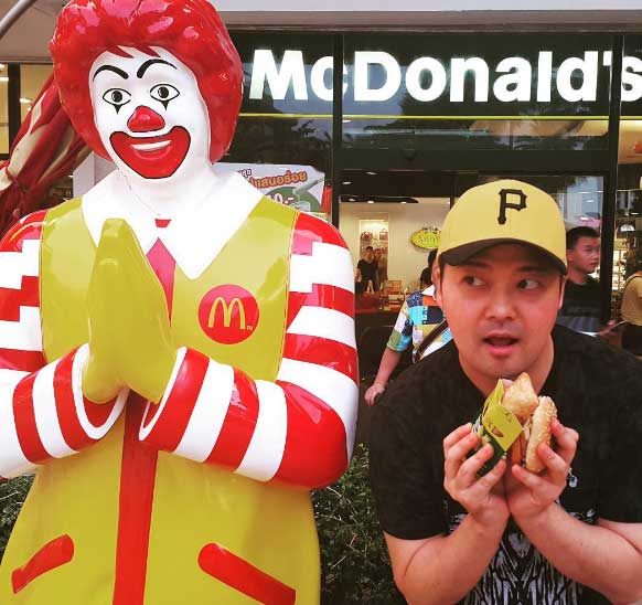 사진 속 전현무는 태국에 있는 맥도날드 앞에서 연어버거와 콘파이를 들고 있다. 또 맥도날드 상징 캐릭터 옆에 서서 두 손을 모으고 곁눈질을 해 보는 이들의 눈길을 끌었다.