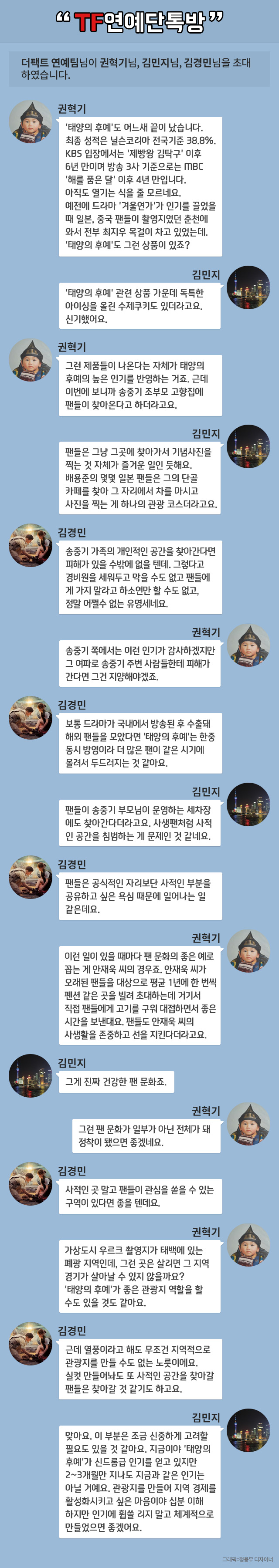 김경민 - 보통 드라마가 국내에서 방송된 후 수출돼 해외 팬들을 모았다면 '태양의 후예'는 한중 동시 방영이라 더 많은 팬이 같은 시기에 몰려서 두드러지는 것 같아요.