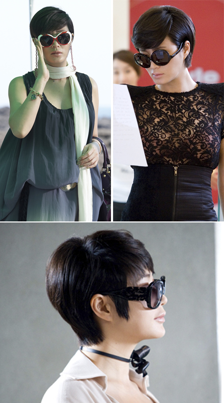 얼굴의 반을 덮는 빅 프레임 선글라스로 박기자를 더욱 도도하게 만들어 줬다. 무조건 고급스럽고 우아한 디자인 만을 선택하는 것은 아니다. 상황과 장소에 따라 선글라스도 달라진다. 극중 제주도 화보촬영 출장에서 컬러감이 느껴지는 맥시 드레스에 흰색 선글라스를 매치했다. 이 선글라스는 화이트 프레임 위에 마치 크레파스로 낙서를 한 것과 같은 키치적인 디자인이 가미됐다.