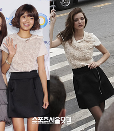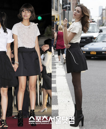 최근 '소녀시대' 멤버 수영이 '슈퍼모델' 미란다 커와 같은 의상을 입었다. 수영은 지난 16일 SBS 사옥에서 열린 'SBS 창사20주년 기념식'에서, 커는 올 초 국내 브랜드 '커밍스텝(COMMING STEP)' 지면촬영에서 입었다. 한국과 미국을 대표하는 롱다리 미녀들은 로맨틱한 의상을 어떻게 소화했는지 살펴봤다.