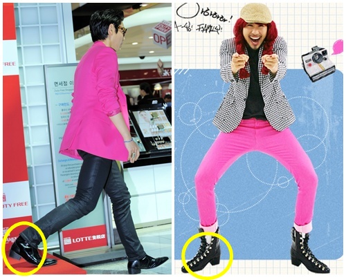 그룹 '샤이니'의 태민도 캐주얼한 차림에 검은 하이힐 부츠를 신은 모습이 공개됐다. 일상 생활에서 포착된 이 사진은 누군가 태민의 하이힐 부츠를 손으로 재보는 모습이었다. 가요계 패셔니스타로 통하는 태민은 스키니진에 하이힐 부츠를 즐겨신어 맵시있는 캐주얼룩을 완성하고 있다.
