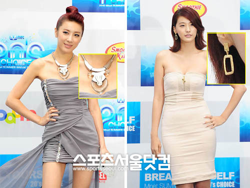 드레스는 다리와 가슴의 대결이었다. 서인영은 미니 드레스로 다리를 강조했다. 덕분에 단신이 눈에 띄지 않았다. 반면 유인영은 가슴을 강조했다. 볼륨감있는 몸매를 강조하기 위해서였다.