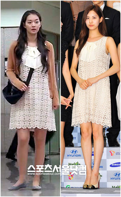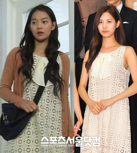 청순함의 대명사 신민아와 소녀시대 서현이 똑같은 화이트 아일렛 원피스를 입었다. 신민아는 드라마 속에서, 서현은 지난 8월 'SM타운 라이브 10 월드투어 인 서울(SMTOWN LIVE 10 WORLD TOUR IN SEOUL)' 콘서트 기자회견에서 입었다. 로맨틱한 분위기가 넘치는 이 원피스를 두 스타는 어떠한 느낌으로 소화했는지 살펴봤다.