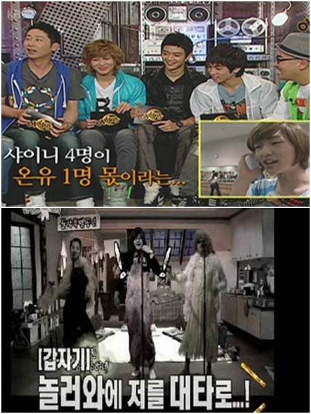 '샤이니' 종현과 민호, 태민과 키는 지난 27일 KBS-2TV '밤샘 버라이어티 야행성'에 출연했다. 뮤지컬 리허설로 녹화에 불참한 온유를 대신한 것. 온유는 방송에 출연하는 대신 전화통화로 참여해 아쉬움을 달랬다.