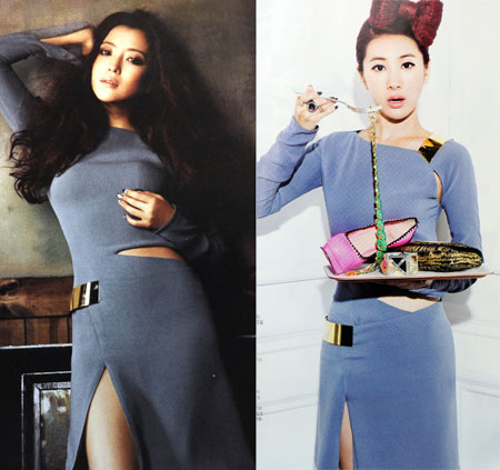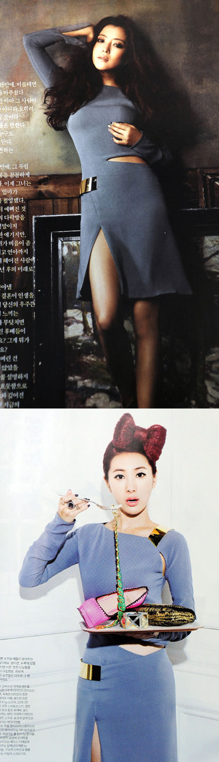 ▶ 어떤 옷? : 화보 속에서 김희선과 서인영이 입은 드레스는 명품브랜드 '구찌(GUCCI)' 2010 가을/겨울 컬렉션 의상이다. 이 드레스는 허리와 어깨 그리고 등이 커팅 된 것이 특징이다. 그 사이로 허리선이 자연스럽게 드러났다. 반대쪽 골반 부분에는 골드 메탈 디테일로 포인트를 줬다. 치마가 아슬아슬한 라인까지 트여져있어 섹시한 분위기가 물씬 풍겼다.
