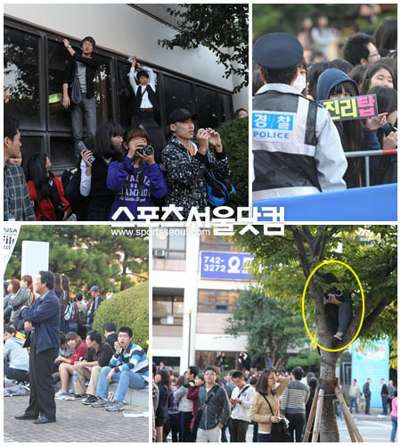 나무타기도 서슴치 않았다. 한 팬은 작은 나무 사이로 올라가 스타들을 기다렸다. 조금 더 좋은 자리에서 보길 원하는 팬들의 마음이 엿보엿다. 몇몇 남성 팬들은 창문에 매달리는 아찔한 순간을 연출해 내기도 했다.