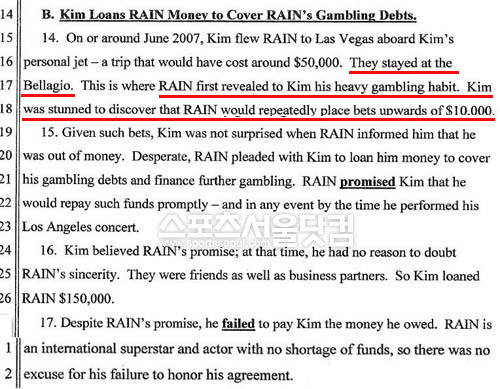 실제로 소장에는 비의 '심각한 도박습관'(heavy gambling habit)이라는 내용이 적시돼 있다. 이는 비 스스로 김 씨에게 털어놓은 내용이다. 또한 최대 1만 달러 이상을 베팅한다는 비의 도박규모가 적혀있다.