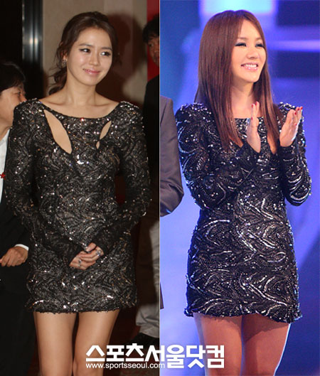 손예진과 엄정화가 똑같은 블링블링 미니드레스를 선택했다. 손예진은 지난달 8일 부산국제영화제에서, 엄정화는 지난달 15일에 방송된 Mnet '슈퍼스타K2'에서 입었다. 이미지가 전혀 다른 손예진과 엄정화는 반짝이 드레스를 어떻게 소화했는지 살펴봤다.