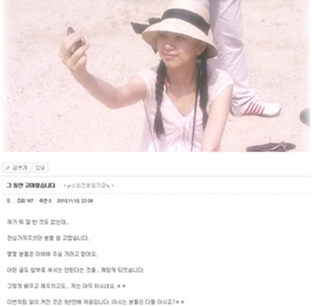 김꽃님은 지난 10일 오후 자신의 팬 카페에 "그동안 고마웠습니다"라는 제목의 글을 게재했다. 그는 "그 동안 많은 에너지를 받아 갔습니다. 제가 뭐 잘 한 것도 없는데 관심 가져주셨던 분을 참 고맙습니다"라고 전했다.