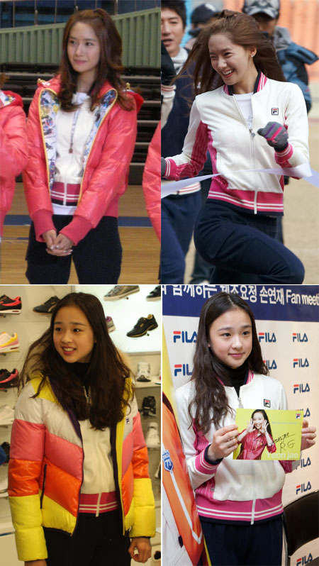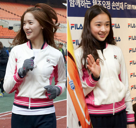 소녀시대 윤아와 리듬체조 국가대표 손연재가 같은 트레이닝복을 입었다. 윤아는 지난 12일 방송된 MBC-TV '일요일 일요일 밤 - 오늘을 즐겨라' 육상 특집에서, 손연재는 지난 10일 롯데백화점 잠실점에서 열린 팬 사인회에서 선택했다.