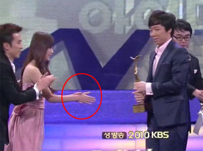 사건은 여기서 발생했다. 개그맨 김기열과 박영진이 시상자인 유희열과는 악수를 하고 아이유와는 악수를 하지 않은 이른바 '악수 굴욕(?)'을 안겨준 것. 해당 영상을 보면 당사자들은 경황이 없었던 탓에 아이유가 내민 손을 못본 듯 수상소감을 위해 몸을 돌렸고 아이유는 당황한 듯 손을 급하게 빼는 모습이 나온다.