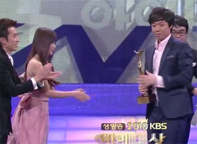 27일 한 인터넷 커뮤니티 사이트에는 "아이유랑 악수하면…" 이란 제목의 영상이 올라왔다. 이 영상에서는 지난 25일 방송된 2010 KBS 연예대상의 한 시상장면이 담겨져 있다.