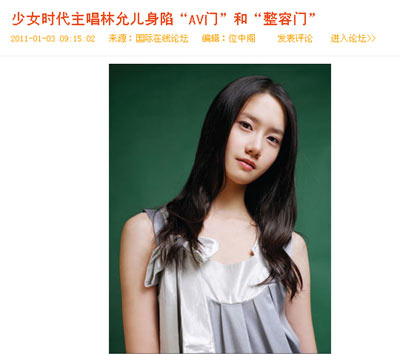 온라인 중국정보 사이트 온바오 닷컴은 3일 중국 포털사이트 왕이(www.163.com)가 "소녀시대 멤버 윤아, AV 출연설 휘말려"란 제목으로 AV 출연설과 성형설을 제기했다고 전했다.