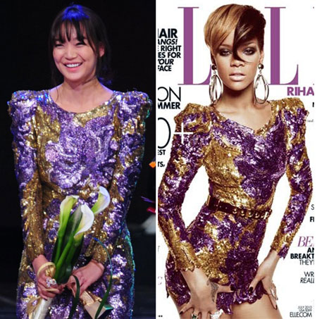 ▶ 어떤 옷? : 신민아와 리한나가 입은 시퀸드레스는 '발망(Balmain)'의 2010 가을/겨울 의상이다. 드레스 전체에 골드와 보라색 스팽글이 데칼코마니를 한 듯 화려하게 장식했다. 어깨에 각을 세워 파워숄더를 완성했다. 때문에 80년대 느낌의 록시크룩 느낌이 물씬 풍겼다. 소매 끝과 드레스 끝을 물결 모양으로 처리하여 여성스런 느낌까지 더해졌다.