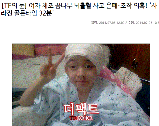 관련 기사 : [TF의 눈] 여자 체조 꿈나무 뇌출혈 사고 은폐·조작 의혹! '사라진 골든타임 32분'