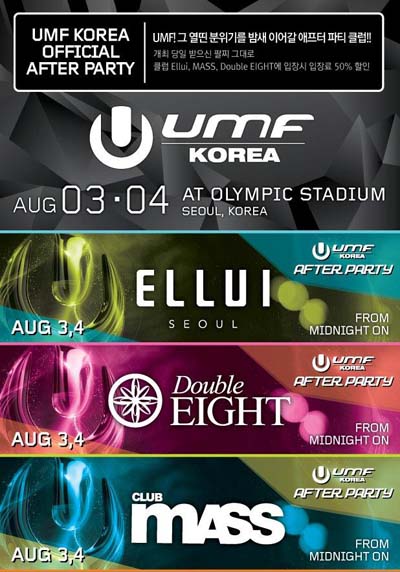 한편, 페스티벌의 뜨거운 열기를 몰고 갈 애프터 클럽 파티도 주목을 끌고 있다. 3일과 4일 밤, UMF KOREA 페스티벌 입장 티켓 팔찌를 착용하고 클럽 엘루이, 클럽 더블에잇, 클럽 매스를 방문하면 입장료의 50%를 할인 받을 수 있어, UMF KOREA에서 함께 열광한 관객들과 함께 흥을 이어서 신나는 파티 분위기를 즐길 수 있다. UMF의 본토 마이애미를 포함하여 UMF가 열리는 도시에서는 이와 같이 페스티벌이 끝난 후 페스티벌 현장 근처의 다양한 클럽에서 파티 분위기를 이어나가는 문화가 형성되어 있고, 해가 갈수록 제휴하는 클럽의 수가 늘어나고 있다.