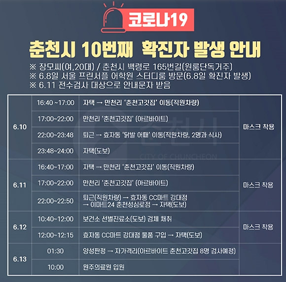 춘천시청 측은 "춘천시 10번째 확진자가 발생했습니다. 동선은 추후 블로그 공개,세부내용 확인바랍니다"라고 설명했다. 확진자는 20대 여성으로 춘천시 백령로 165번길에 거주하는 것으로 알려졌으며 지난 8일 서울 프린서플 어학원 스터디룸을 방문했다가 감염된 것으로 알려졌다.