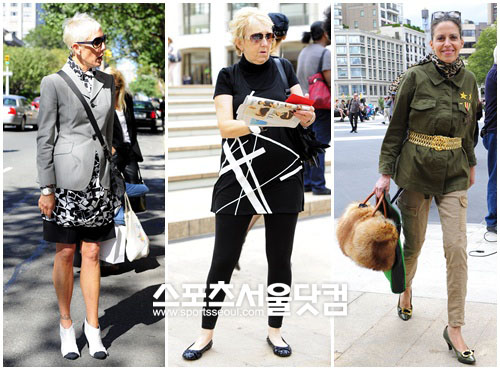 뉴욕의 실버 세대들은 신세대 못지 않은 패션 센스를 선보였다. 미니 원피스와 재킷을 믹스매치한 패션은 물론 레깅스 패션과 밀리터리 룩 까지 다양한 스타일을 소화해 내는 모습이었다. 당당하고 멋진 실버 뉴요커들의 패션이었다.