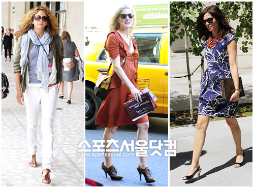 중년의 여성들에겐 역시 하이힐이 대세였다. 자외선이 강하게 내리쬐는 뉴욕에서는 선글래스도 필수였다. 화이트 스키니 진에는 머플러로 멋과 보온성도 놓치지 않았다. 눈에 띄는 레드와 블루 컬러 원피스도 과감하게 소화해냈다.