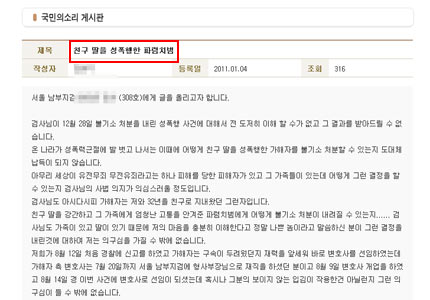한 매체의 보도에 따르면 지난 4일 서울 남부지검 홈페이지 '국민의 소리' 게시판에 '친구 딸을 성폭행한 파렴치범'이라는 제목의 글이 올라왔다.