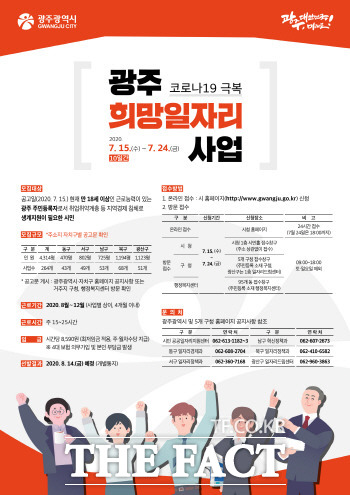 15일부터 생활방역·환경개선 등 264개 사업 참여자 접수[더팩트ㅣ광주=허지현 기자] 광주광역시는 오는 15일부터 코로나19 확산방지를 위한 생활방역 등 희망일자리사업에 참여할 시민 4314명을 모집한다.