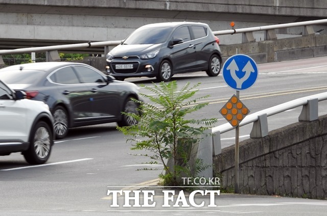 [더팩트ㅣ포항=김달년 기자] 포항시의 주요 사거리 중의 하나인 대잠사거리 한켠 종합운동장에서 포항시청 방향의 고가교 입구에 잡목이 자라고 있다.