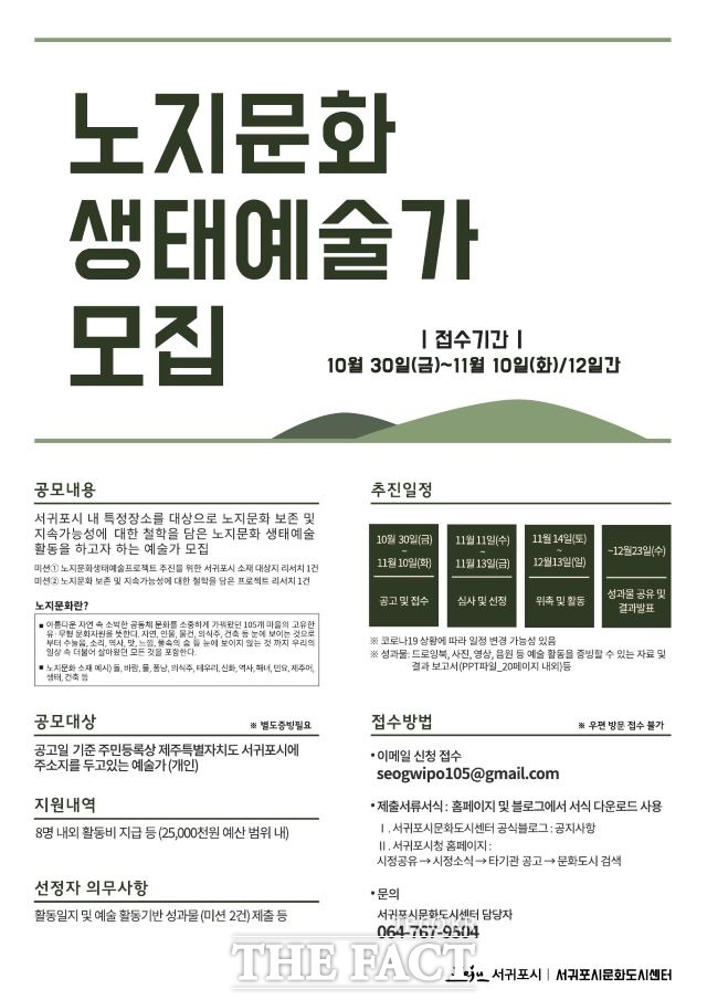 [더팩트ㅣ제주=김용덕 기자] 서귀포시 내 특정 장소를 기반으로 노지문화 보존 및 지속가능성에 대한 철학을 담은 노지문화 생태예술 활동을 하고자 하는 예술가를 모집하는 이번 공모는 10월 30일(금)부터 11월 10일(화)까지 접수한다.