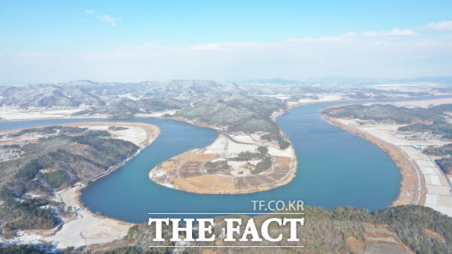 [더팩트ㅣ나주=문승용 기자] 14일 한반도 지형을 닮은 전남 나주시 동강면 느러지 일대 산과 들에 첫눈이 내려 장관을 이루고 있다. 사진 나주시 제공.
