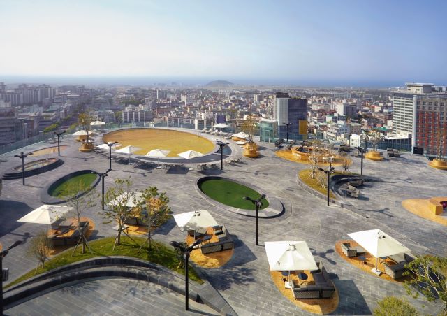 야외 풀데크는 4290㎡의 제주 최대 규모로, 고도 62m에 위치해 도심과 바다, 공항까지 제주도를 한눈에 시원하게 즐길 수 있다.