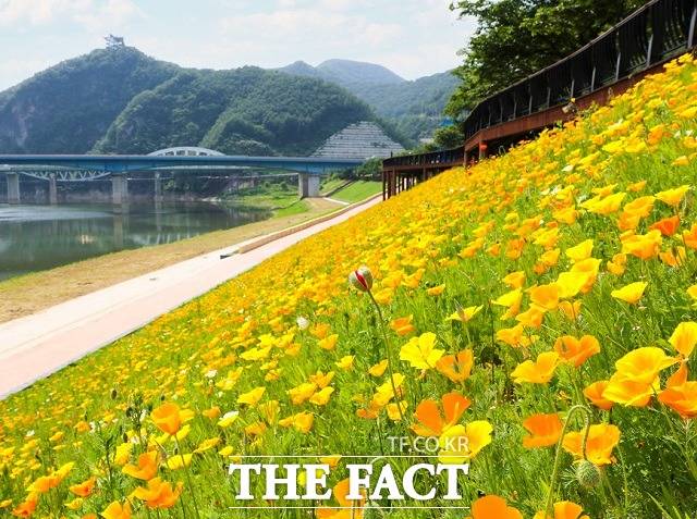 단양강 수변 인공콘크리트 사면에 금영화와 꽃양귀비가 활짝 피어 관람객 눈길을 사로잡고 있다. / 단양군 제공