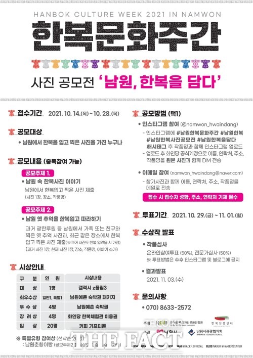 2021 '남원 한복문화 가을주간'의 일환으로 열리는 이번 한복사진 공모전은 '한복과 함께 추억'이란 주제로 한복과 남원을 표현한 사진이라면 누구나 응모할 수 있다.