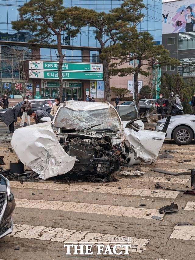 [더팩트 | 김연수 기자] 경북 포항 도심 대로에서 4중 추돌사고가 발생해 4명이 부상을 입고 신호기 등이 파손됐다.